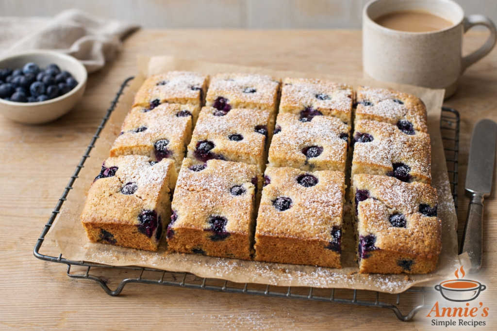 blueberry traybake cake recipe / casual gathering dessert / easy blueberry cake recipe / easy vanilla and blueberry cake / gentle dessert idea / homemade blueberry cake / one-tray berry cake / simple vanilla sponge traybake / soft vanilla sponge with blueberries / summer berry cake / teatime blueberry cake / vanilla blueberry traybake cake